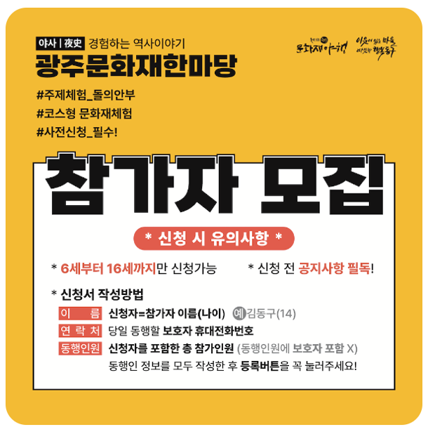 광주문화재야행은 전체적으로 무료로 펼쳐지지만 일부 유료로 진행되는 곳도 있으니 미리 알아보시고 더 깊은 체험을 해보셔도 좋을듯 합니다.