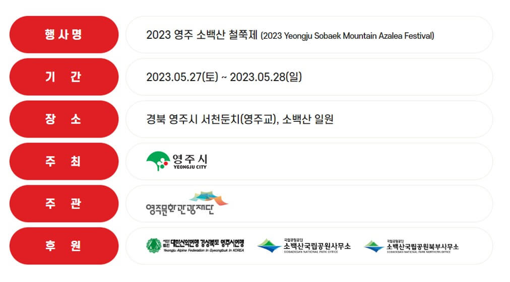 영주 소백산 철쭉제는 2023년 5월 27일 부터 5월 28일 까지 진행됩니다.